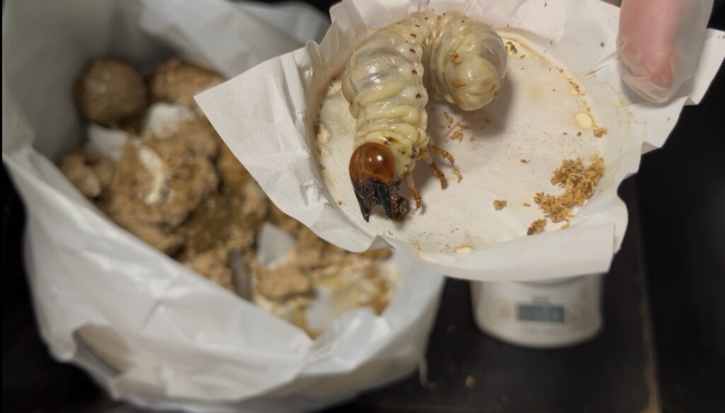 今回交換していると、ほとんどの個体が菌糸瓶の大部分を食べていたのに対して、ほとんど食べておらず、ボトルの外から見ても明らかに小さい個体がいましたが、その個体は残念ながら病気にかかっているようでした😔